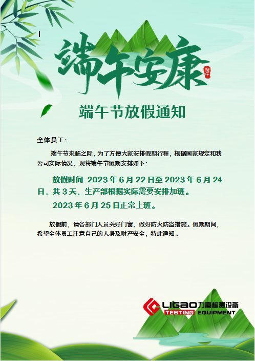 門插艾,香滿堂,吃粽子,撒白糖”,時(shí)光荏苒,一年一度的端午節(jié)即將到來,拉力試驗(yàn)機(jī)生產(chǎn)廠家江蘇力高檢測設(shè)備有限公司提前祝全體員工端午安康,一帆風(fēng)順。端午節(jié)是中國的傳統(tǒng)節(jié)日,2023年根據(jù)國家節(jié)假日管理按排放假3天。祝大家:端午節(jié)快樂。